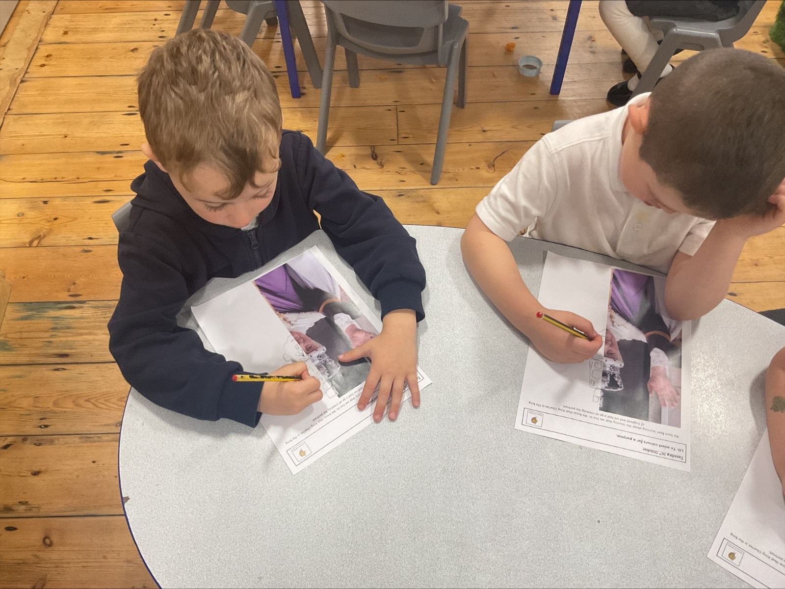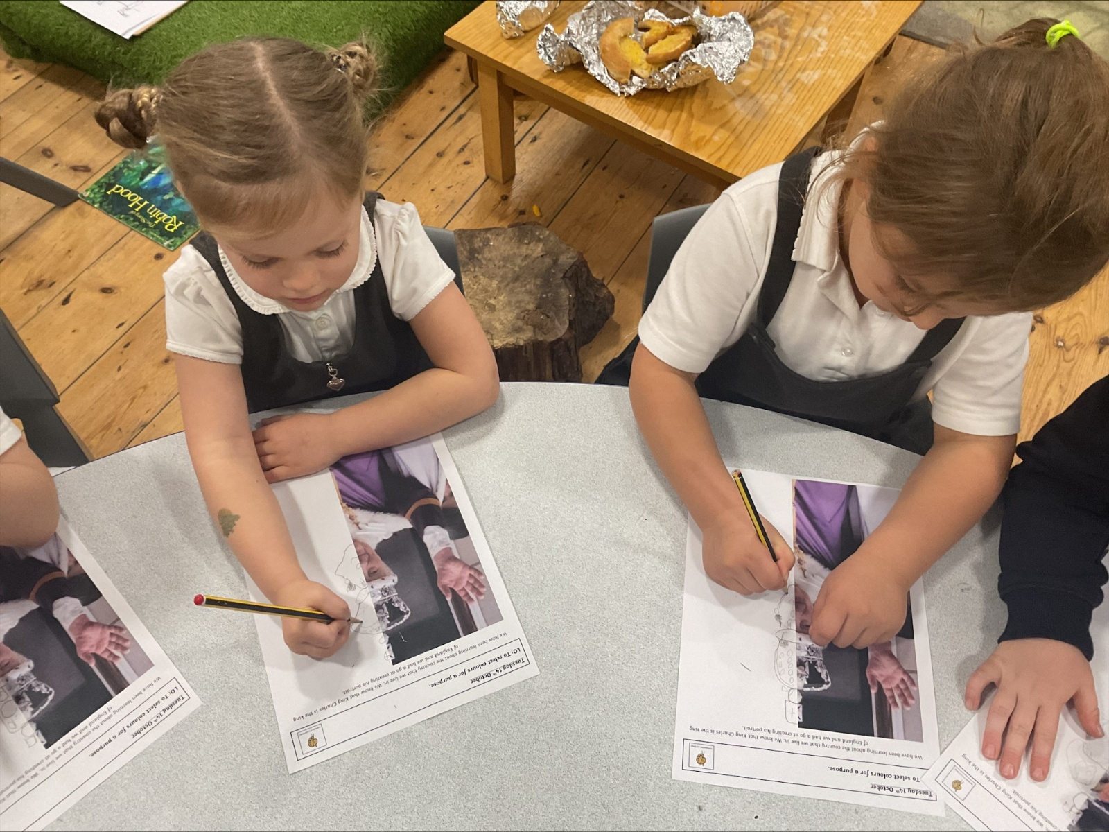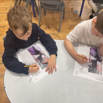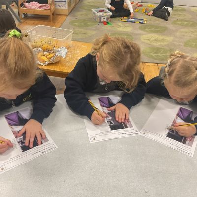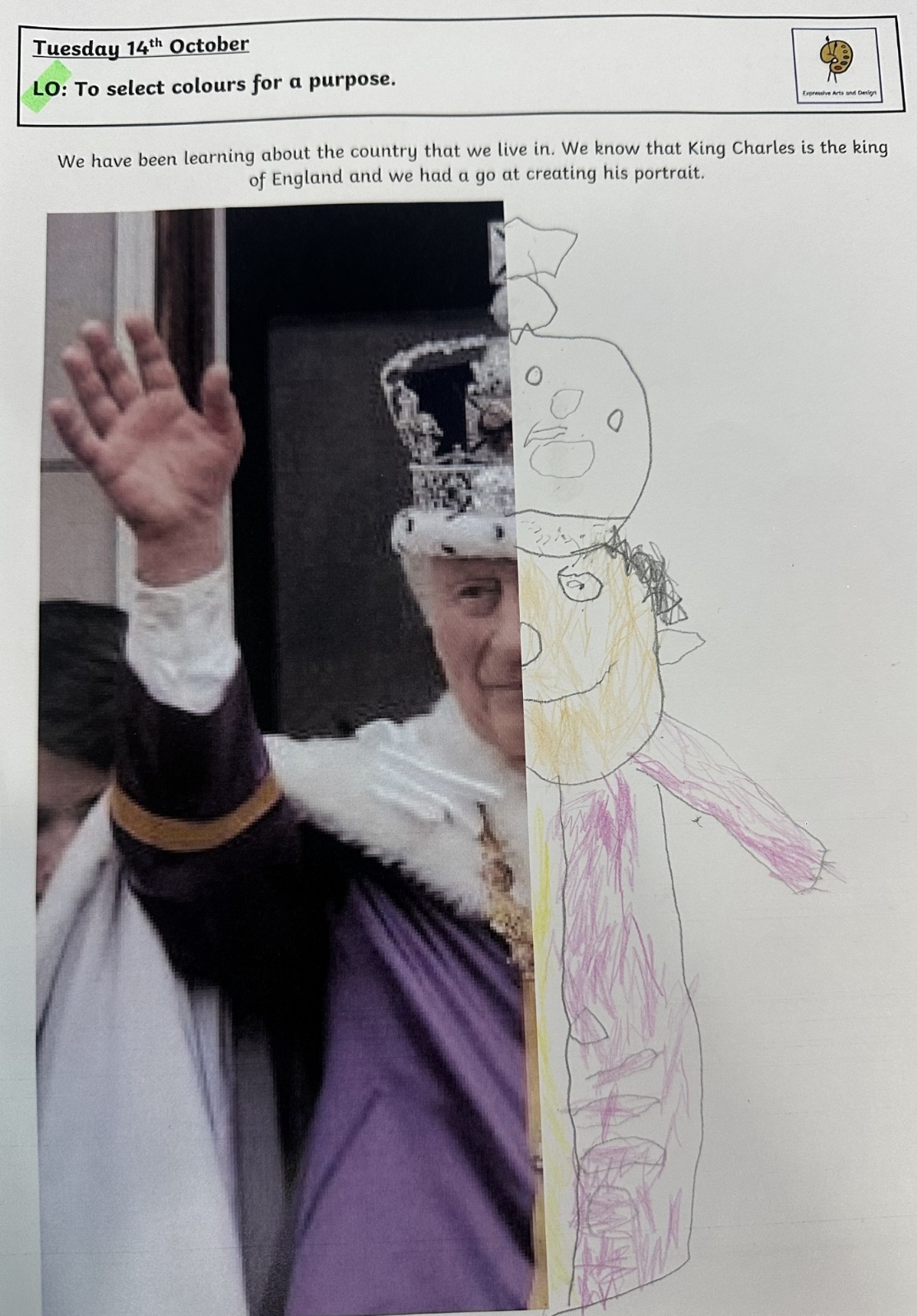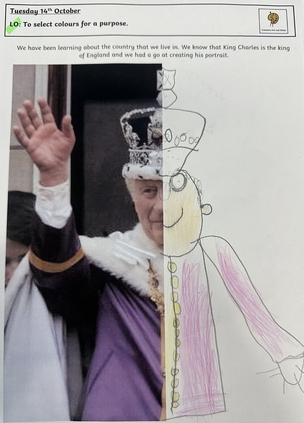 After learning about King Charles, in Expressive Arts and Design (Art), we created our own portraits of the King. We looked closely at images of him and used the correct colours to make our pictures as accurate as possible.