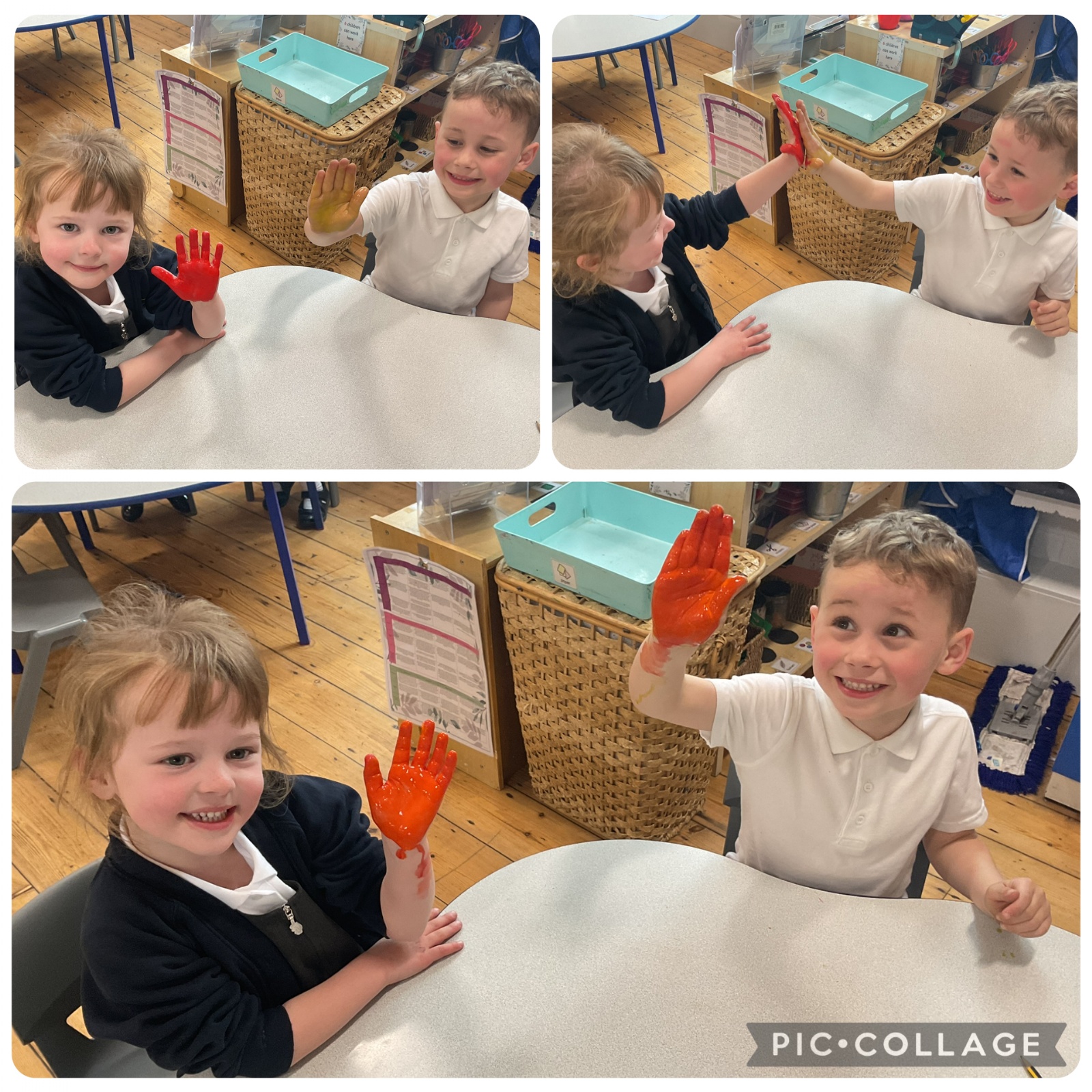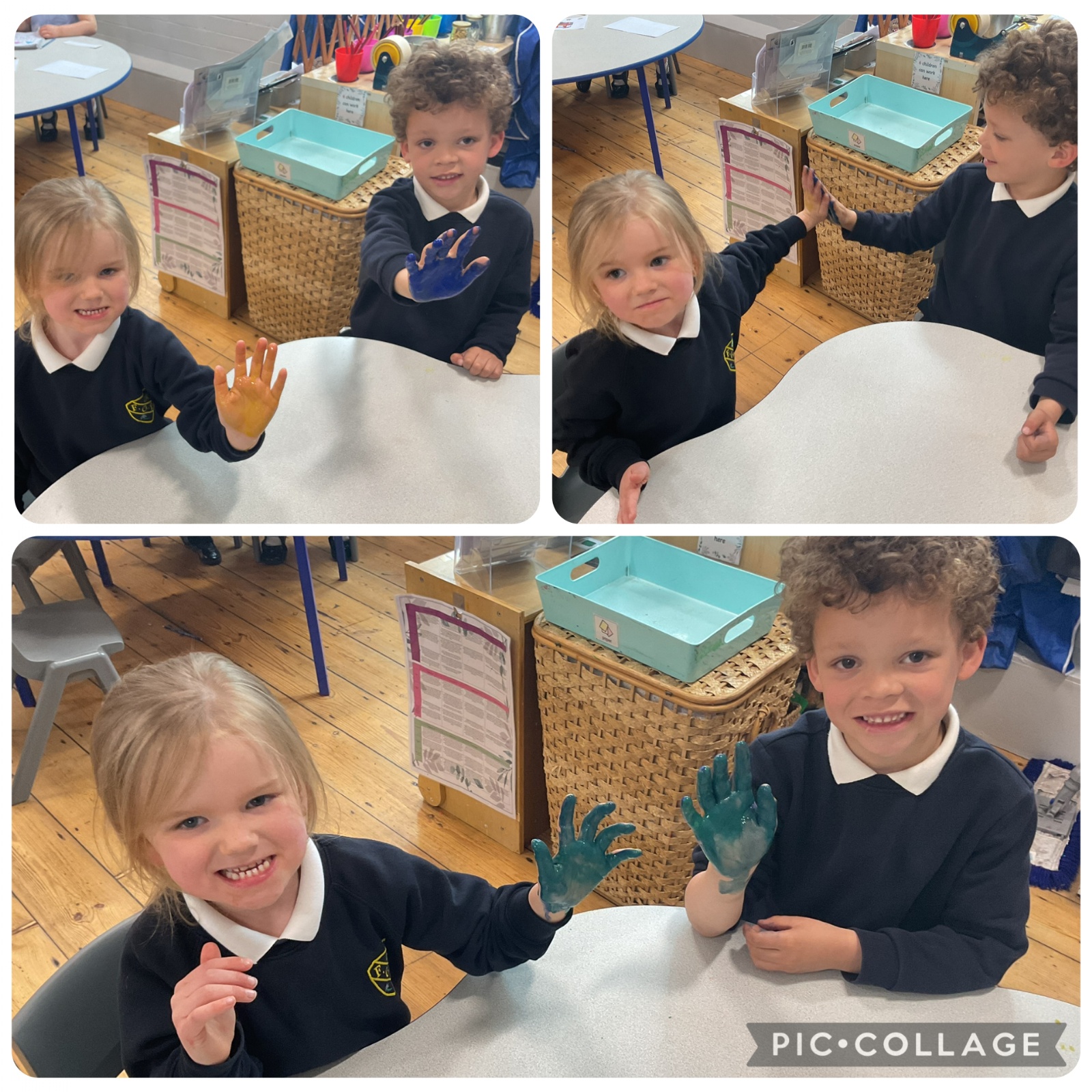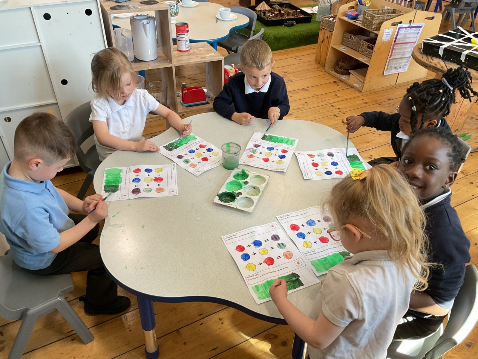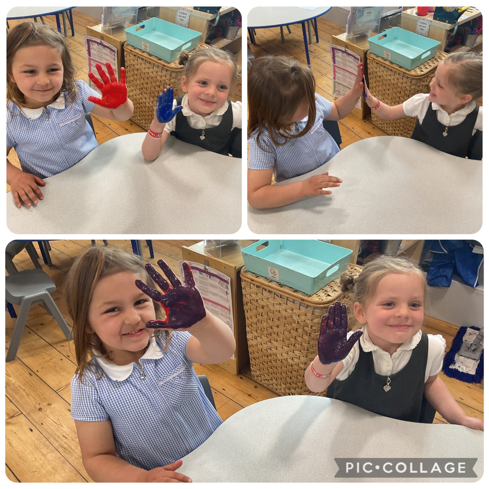 They learnt that the primary colours are red, blue, and yellow, and discovered how mixing them creates new colours. Red and blue made purple, red and yellow turned into orange, and blue and yellow turned into orange, and blue and yellow became green. They had lots of fun creating their own colour mixes and even worked together, mixing colours using a friend’s hand.