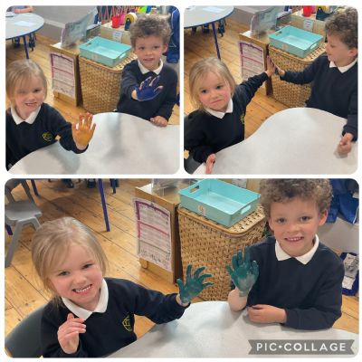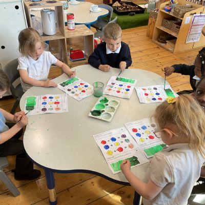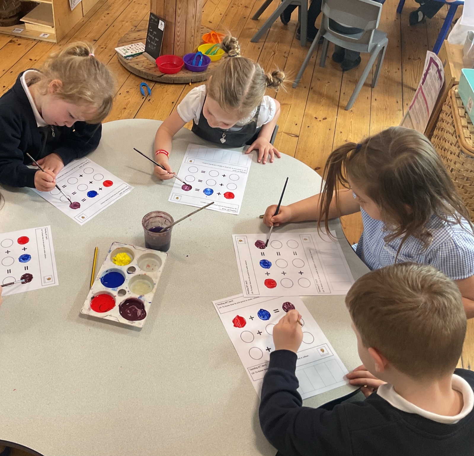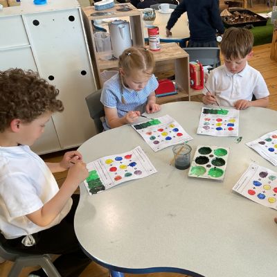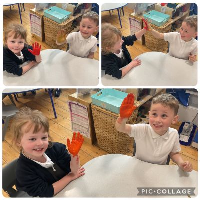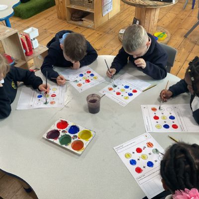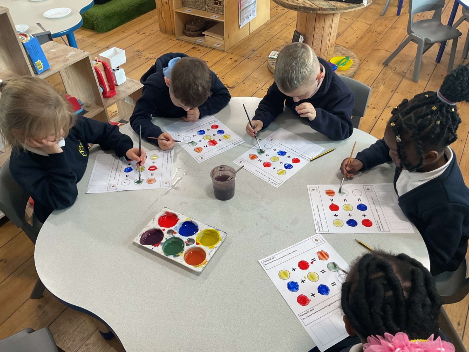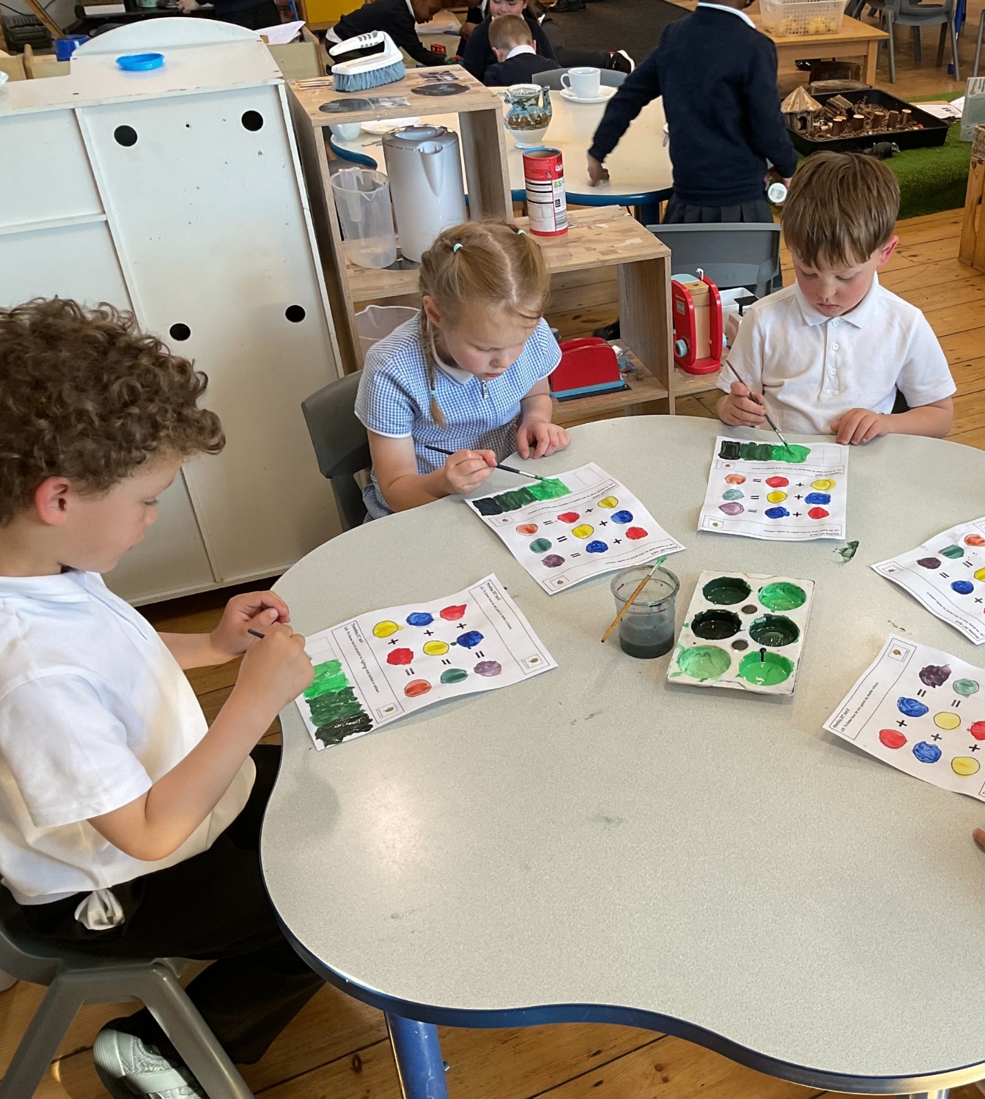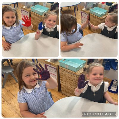 They learnt that the primary colours are red, blue, and yellow, and discovered how mixing them creates new colours. Red and blue made purple, red and yellow turned into orange, and blue and yellow turned into orange, and blue and yellow became green. They had lots of fun creating their own colour mixes and even worked together, mixing colours using a friend’s hand.